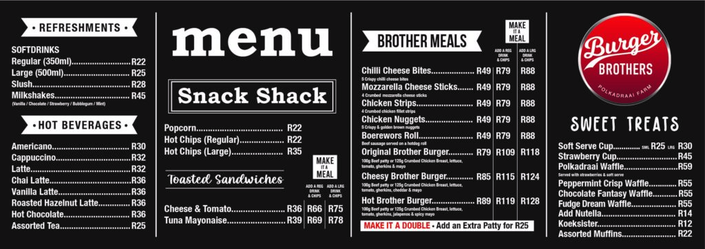 The menu includes hot food items such as burgers and fries, tender chicken strips as well as other tasty treats!